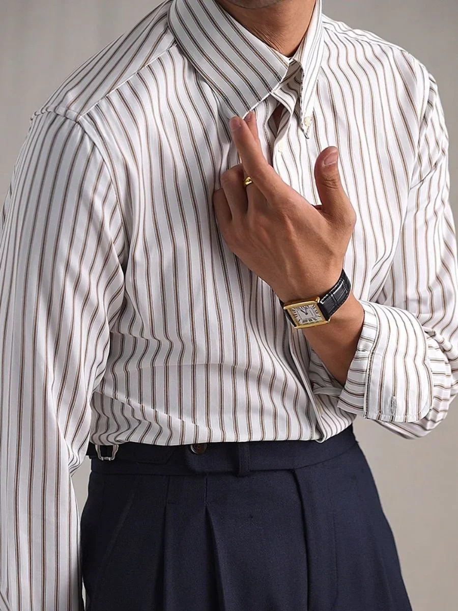 Crafted from a soft and breathable cotton-blend, this long-sleeve shirt features a traditional pointed collar and timeless striped pattern. A versatile option for both casual and business settings, it offers a clean silhouette and refined finish.