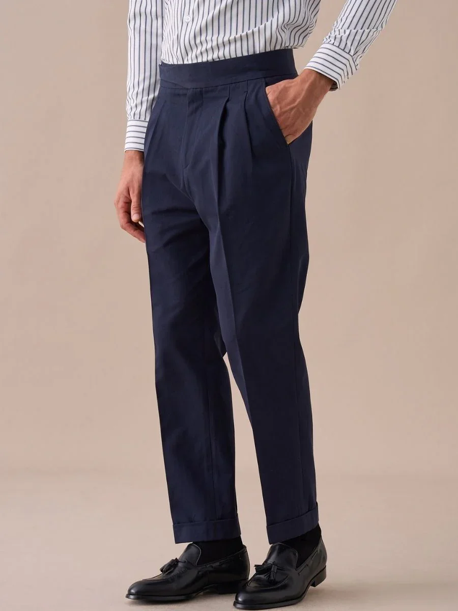 The rise of these Gurkha Pants creates a longer visual line, enhancing balance between torso and legs. The extended waistband with side-tab buckles provides both security and distinctive character, eliminating the need for a belt. Pleats add space through the thighs, ensuring comfort while preserving a clean drape whether seated or walking. The leg profile is straight with a subtle taper, allowing the trousers to rest neatly on shoes without excess fabric. Reinforced seams and pocket edges increase durability, while the structured design maintains sharpness over time. Compared with casual alternatives, these High Waisted Pants keep their form and resist sagging, delivering reliability for long-term wear. Every detail reflects a focus on balance, proportion, and understated style, resulting in trousers that remain relevant season after season.